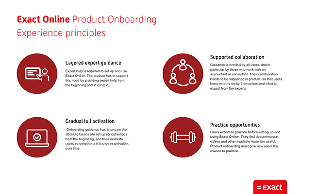 Findings of the discovery phase of the project indicated that many users required further guidance during their onboarding process. Even users who had expert support from an Exact consultant or accountant/bookkeeper.